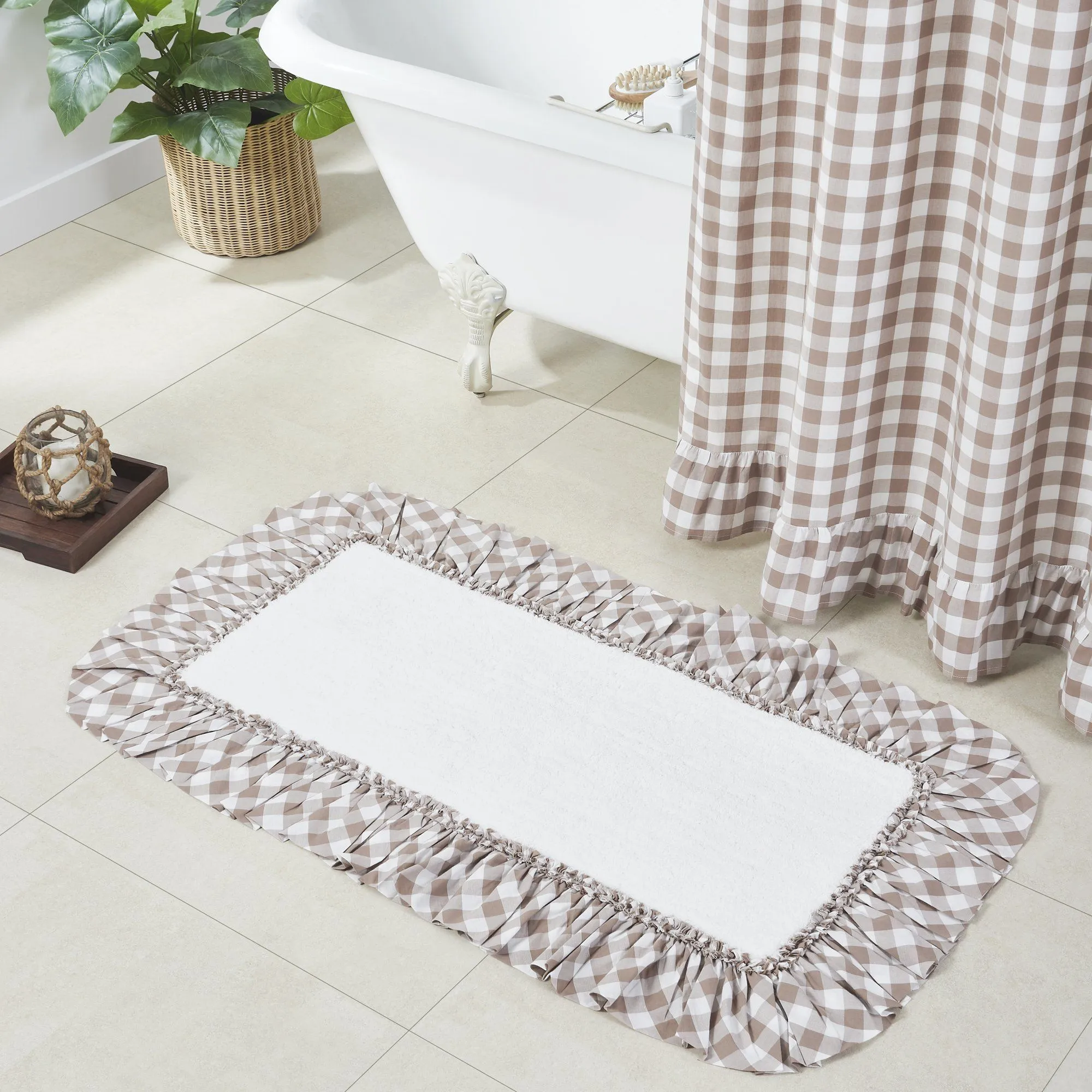 Grace your bathroom floor with our farmhouse-inspired Annie Portabella Buffalo Check bathmat that will give your guests comfort after their long shower. This bathmat features a white center with a beautiful ruffled edge. The buffalo check pattern offers colors of soft white and brown.