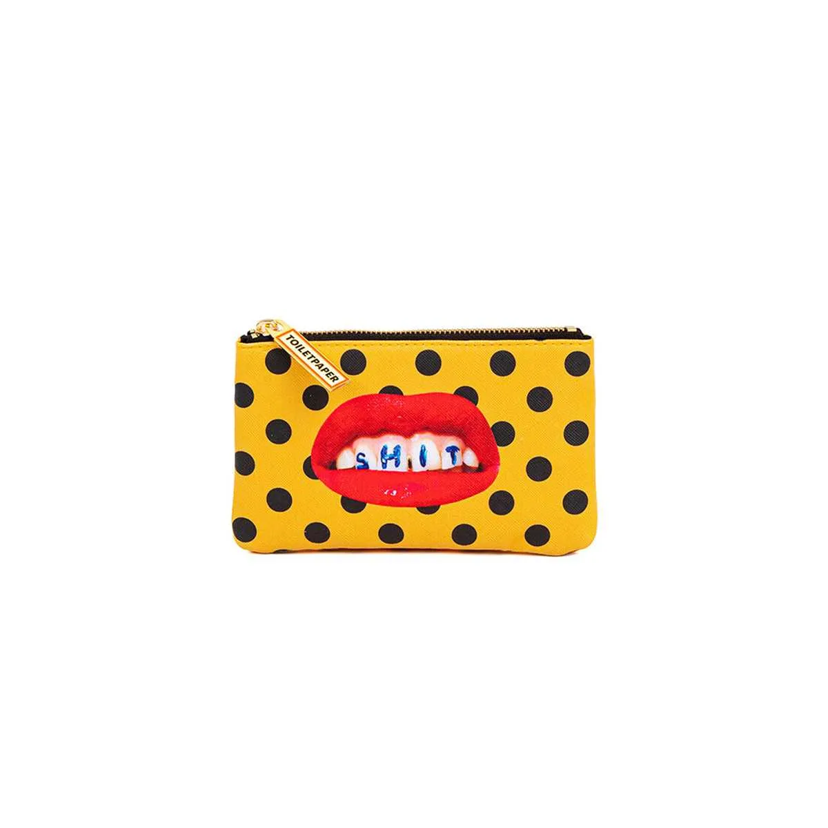 The Case Shit is a designer purse depicting a severed face showing teeth on a yellow background and black polka dots. From the so-called ‘black humor’ blossomed from the collaboration between Seletti and Toiletpaper, the magazine of Maurizio Cattelan and Pierpaolo Ferrari, a curious and unusual collection of beauty cases, purses, pencil cases, notebooks and candles was born. What are you waiting for? Collect the whole collection!